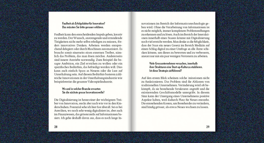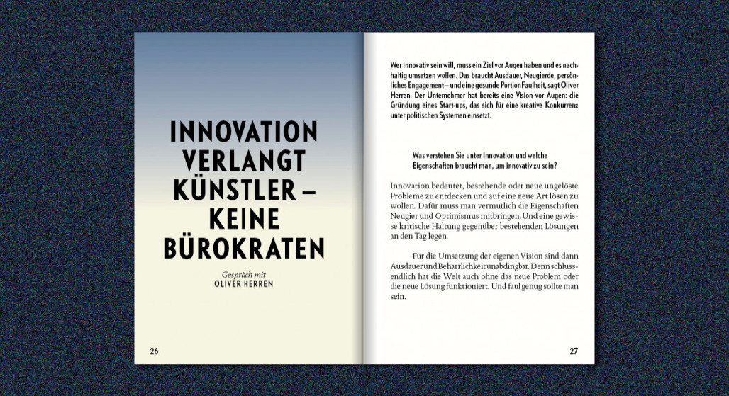 Zu diesen und anderen Fragen äussern sich Prof. Dr. Caspar Hirschi, Wissenschaftshistoriker an der Universität St. Gallen und Experte für die Organisation von Innovation, Oliver Herren, Unternehmer und Gründer des Online-Shops digitec.ch sowie Stephan Sigrist, Gründer und Leiter des Think Tanks W.I.R.E. und Stefan Pabst, der sich bei W.I.R.E. mit Innovationsmanagement im Kontext von gesellschaftlichen Werteänderungen auseinandersetzt