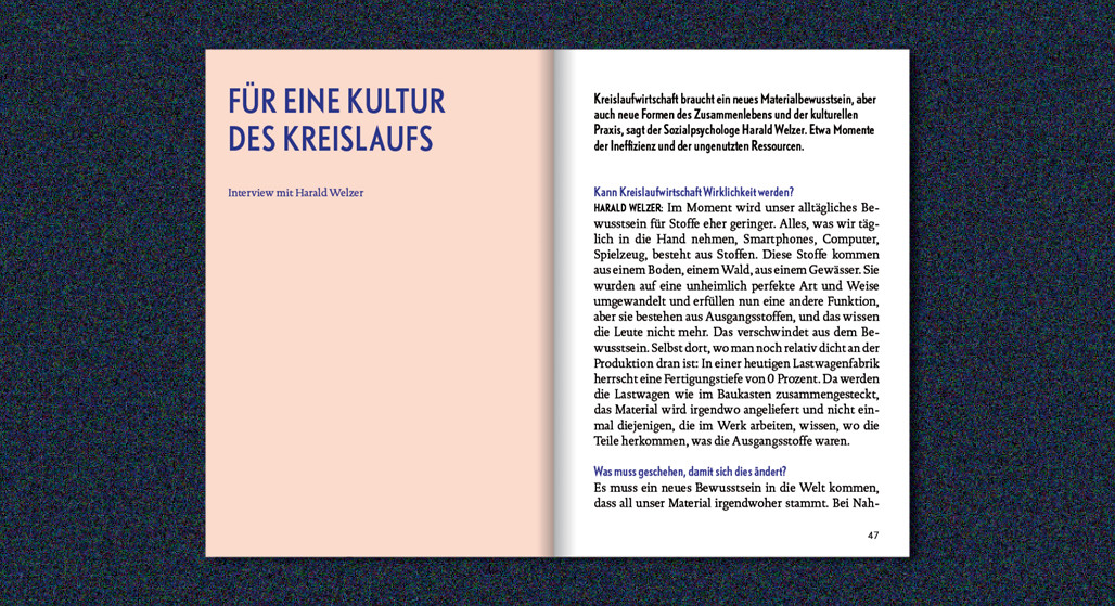 Wie lässt sich Kreislaufwirtschaft konkret umsetzen? Welche neuen Technologien ermöglichen Zirkularität? Kann es ohne die Entsorgung des Alten noch Wirtschaftswachstum geben? Und wie verändert das Gebot des Kreislaufs unser Zusammenleben, unser Wohnen und unsere Städte? Zu diesen Fragen äussern sich Dirk E. Hebel, Professor für Nachhaltiges Bauen am Karlsruher Institut für Technologie, die in Genf tätige Unternehmerin Brindusa Burrows, der Autor und Professor für Transformationsdesign Harald Welzer sowie der Think Tank W.I.R.E.
