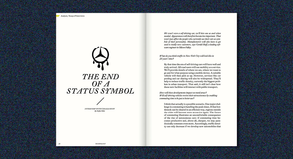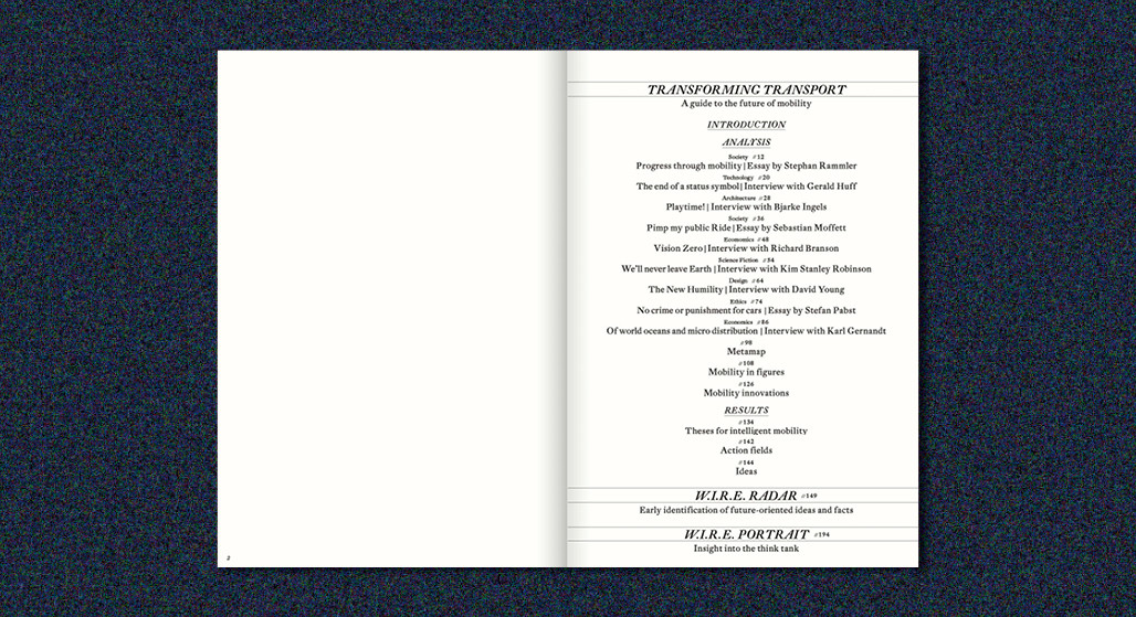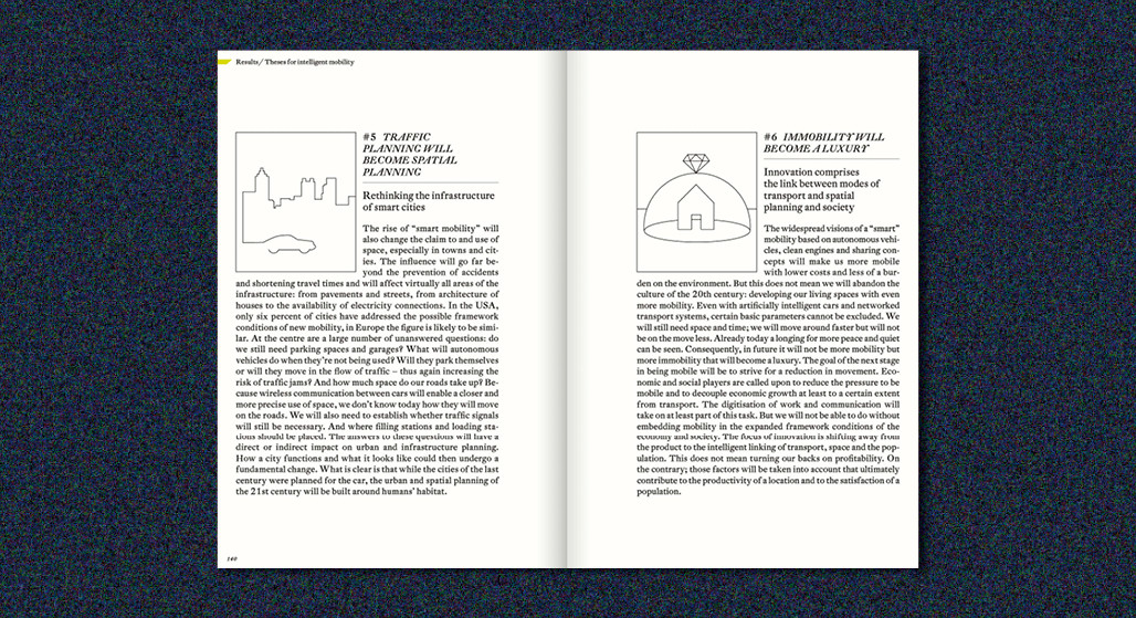 We live in the age of mobility. Being on the go is part of the way we perceive ourselves in modern life, and a basic condition for human evolution. The global transportation of goods is considered to be a driver of economic growth, mobility promotes diversity and innovation. However, the mounting volume of traffic is reaching limits: transport systems in urban areas are congested, climate-related risks and the pressure on hypermobile humans are increasing. Technological progress now promises a transition to a new era of intelligent mobility, characterised by clean drive technologies and autonomous vehicles that herald more efficiency, safety and time. We therefore have to prepare for the future environment of these new, transforming transport systems. Nevertheless, critical questions also have to be asked, because more efficiency will lead to more mobility, which will make even more demands on our living environment instead of easing the strain. And some in-depth exploration is needed of the hype surrounding the mobility revolution, self-driving cars and electric mobility. Will the new technological capabilities fundamentally transform mobility, or will they ultimately prove to be only corrections of the status quo? The fact is that the future of mobility comprises far more than innovation in our vehicles. It will affect the way we live and how we communicate, and will ultimately change our economic system and the whole of society.