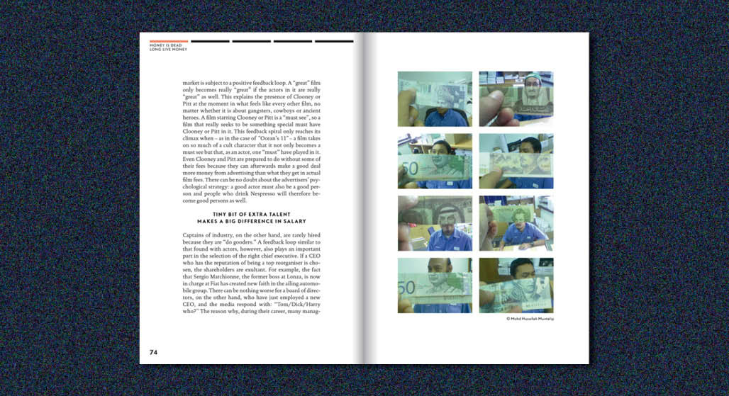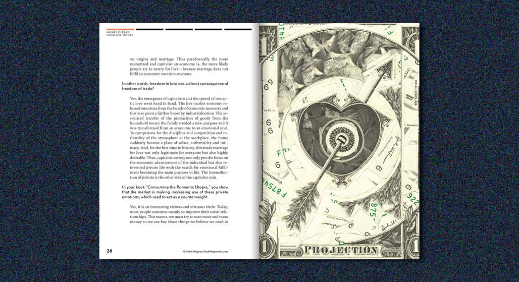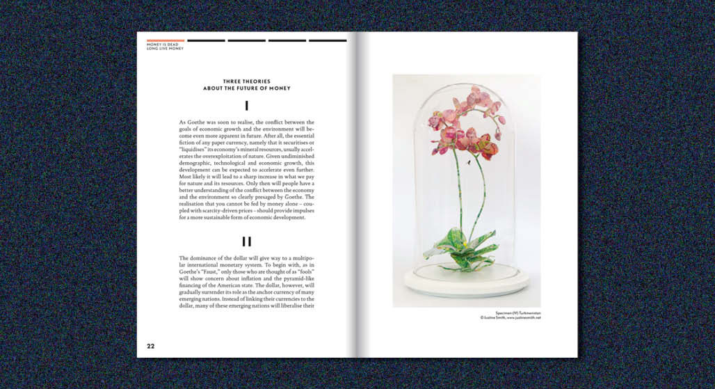 The financial crisis of 2009 and the present shakeup in the Eurozone have forced the global village to embrace a common fate, faced with the challenge of adapting the money system to the environmental conditions of the future. Is the era money drawing to a close? Unlikely. Because money is much more than a means of payment. It is a cultural asset that shapes not only global trade but also our social structures and norms – whether as a basis of trade or a status symbol. But for it to be embedded sustainably in the world of tomorrow, a reconsideration of its form and function is inevitable. Money is dead. Long live money. With contributions from sociologist Eva Illouz, “Happy Planet Index” developer Nic Marks, technology journalist Duncan Jefferies and economist Mathias Binswanger.